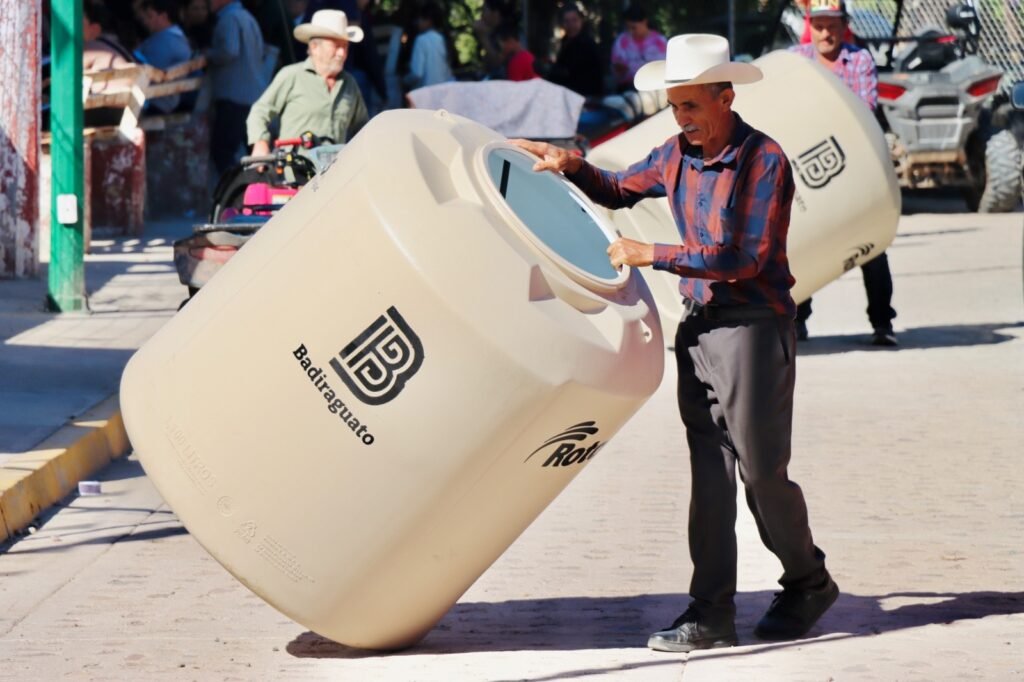 Badiraguato, Sinaloa.– En gira por comunidades de la zona serrana, el alcalde José Paz López Elenes encabezó la entrega de tinacos del programa municipal Mitigar efectos de la sequía y distribuyó harimasa a familias de Otatillos, Tameapa y Santiago de los Caballeros.