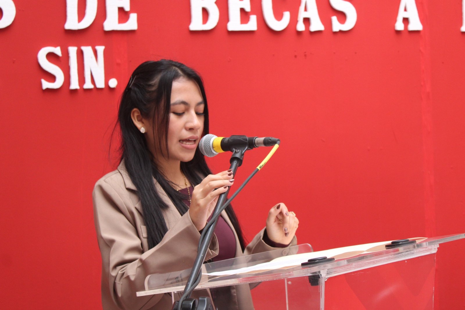 Durante el acto, Nadia Karime Villalobos Pereyra, beneficiaria e hija de un policía fallecido, afirmó que el apoyo permitirá a los estudiantes continuar con sus estudios pese a la ausencia de sus padres.